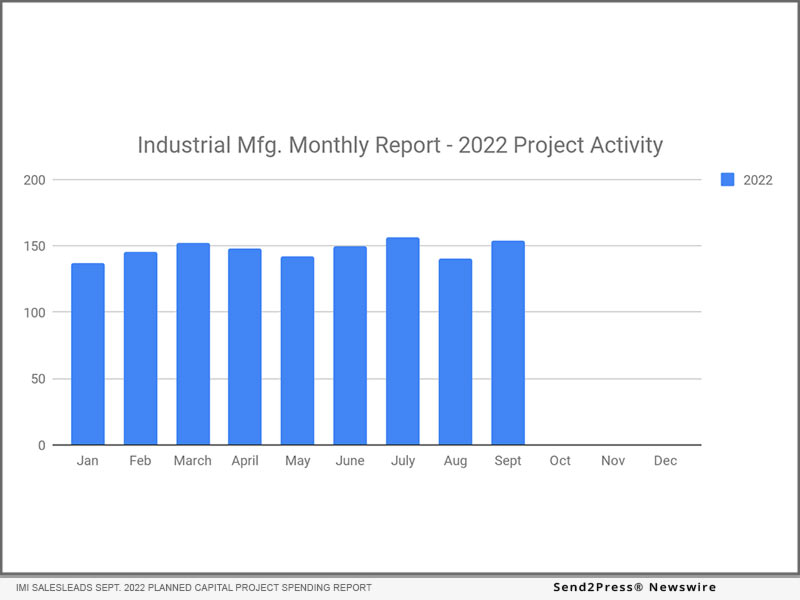 JACKSONVILLE BEACH, Fla. /Massachusetts Newswire – National News/ — IMI SalesLeads announced today the September 2022 results for the new planned capital project spending report for the Industrial Manufacturing industry. The 154 new projects increased from August 2022 140 manufacturing projects, however, down from 162 in September 2021.